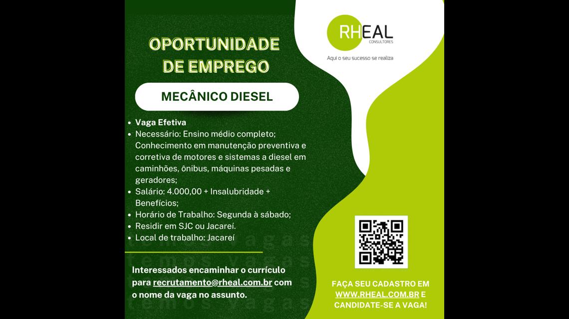 - Necessário: Ensino médio completo; Conhecimento em manutenção preventiva e corretiva de motores e sistemas a diesel em caminhões, ônibus, máquinas pesadas e geradores;